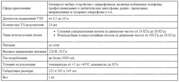 | У прибора 24 излучателя ультразвука | такое количество излучателей создает очень мощную и эффективную помеху, действующую практически на любые микрофоны. В зоне действия прибора невозможно вести запись на смартфоны, диктофоны и другие гаджеты. |