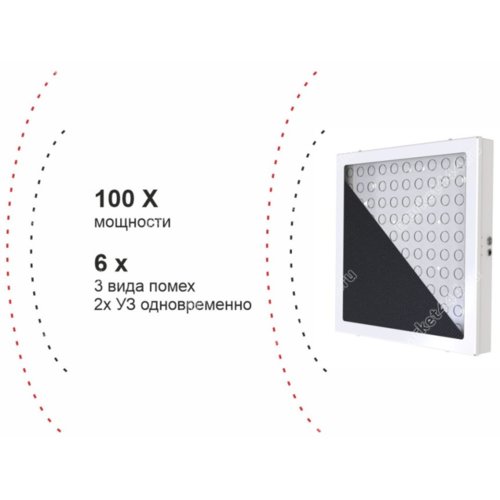 Внутри корпуса расположены 100 УЗ излучателей помех. Данный подавитель микрофонов отличается очень высокой мощностью. Это стало возможным благодаря использованию 100 УЗ излучателей, которые создают поток ""плотного"" сигнала. Он оказывает блокирующее воздействие на звукозаписывающие устройства. На расстоянии до 10 м от излучателей не будет работать ни один диктофон, смартфон или другое устройство. Оптимальное расстояние для работы прибора составляет 4 м, а угол распространения помехи 180°.